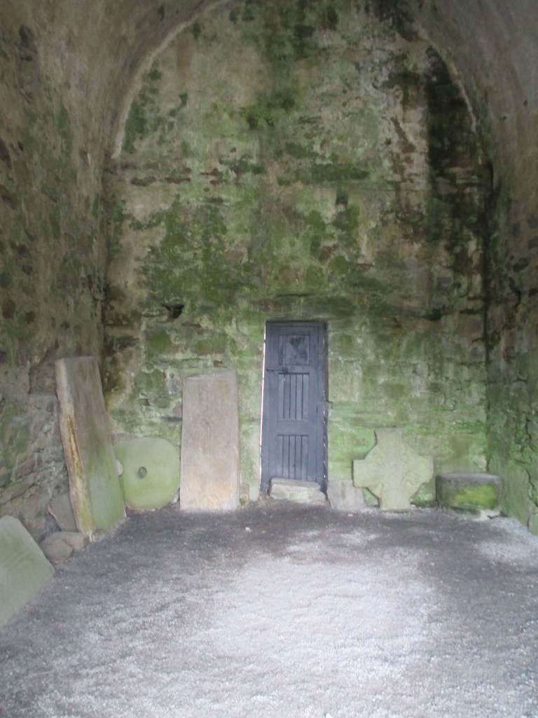 St. Kevin’s Church is dedicated to St Kevin and most likely replaced a wooden church that stood on the site. The belfry looks a bit like a chimney, so it is also known as Kevin’s Kitchen. The church most likely dates from the 1100s CE, though the tower was probably added later. There would have been a second story within the church, which would have acted as living quarters. You aren’t allowed into the church, but if you are wondering how I have included a photo of the interior, you can see my method in the image below.