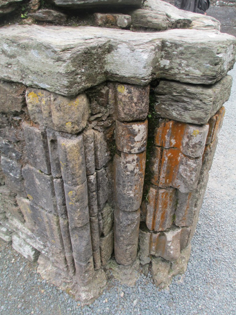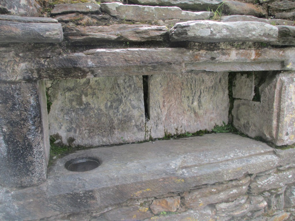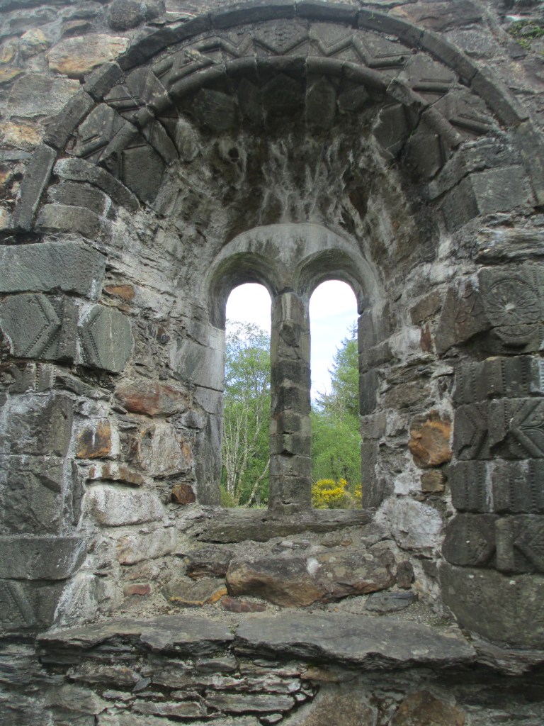 It was only designated as a cathedral until 1214 CE when the Glendalough Diocese was combined into the Dublin Diocese. The exterior stonework is rough, but would most likely have been plastered originally. The building is a bit of an amalgam, with the chancel definitely being added later and being of rougher construction than the rest of the building. There is still some lovely carving that you can see in the images above. The other interesting feature of the cathedral is an embrasure in one wall. It would have had a door for storing precious objects and the small basin in it is the piscina, and would have been using for pouring away holy water so it couldn’t be used for unauthorised purposes.