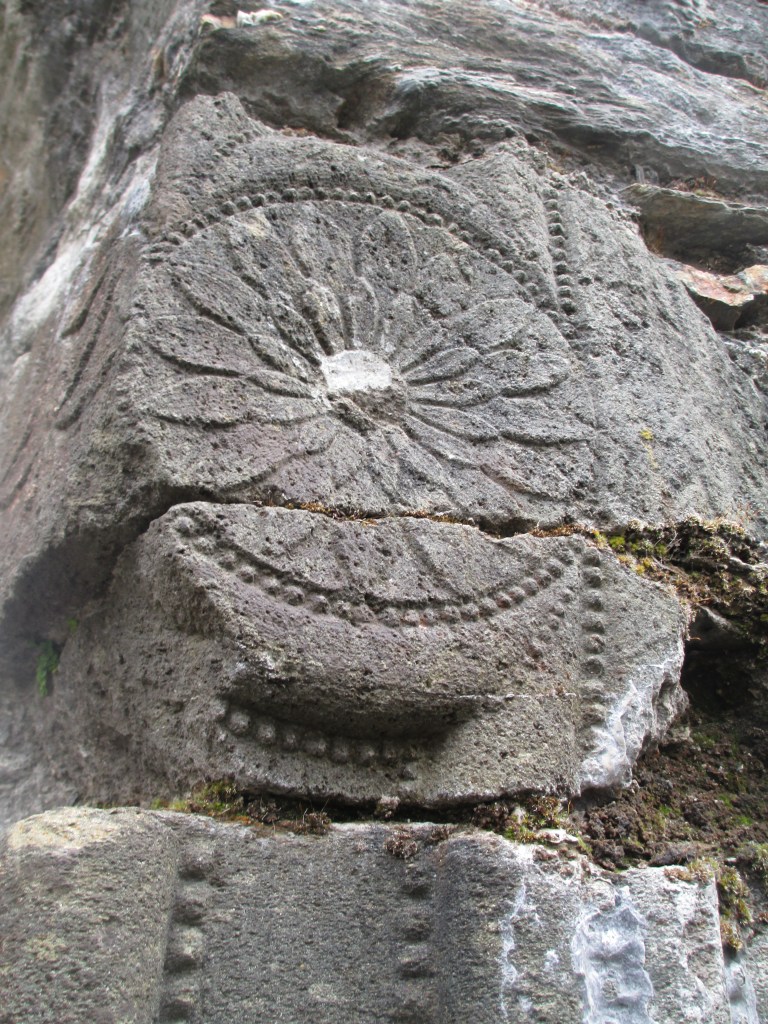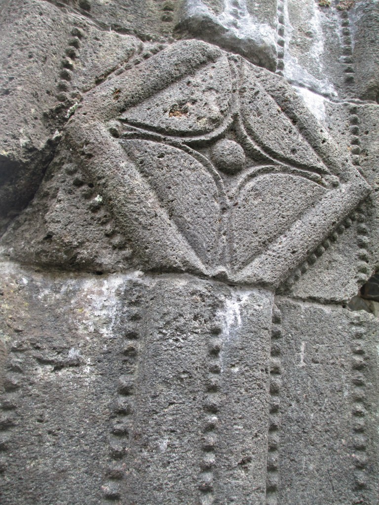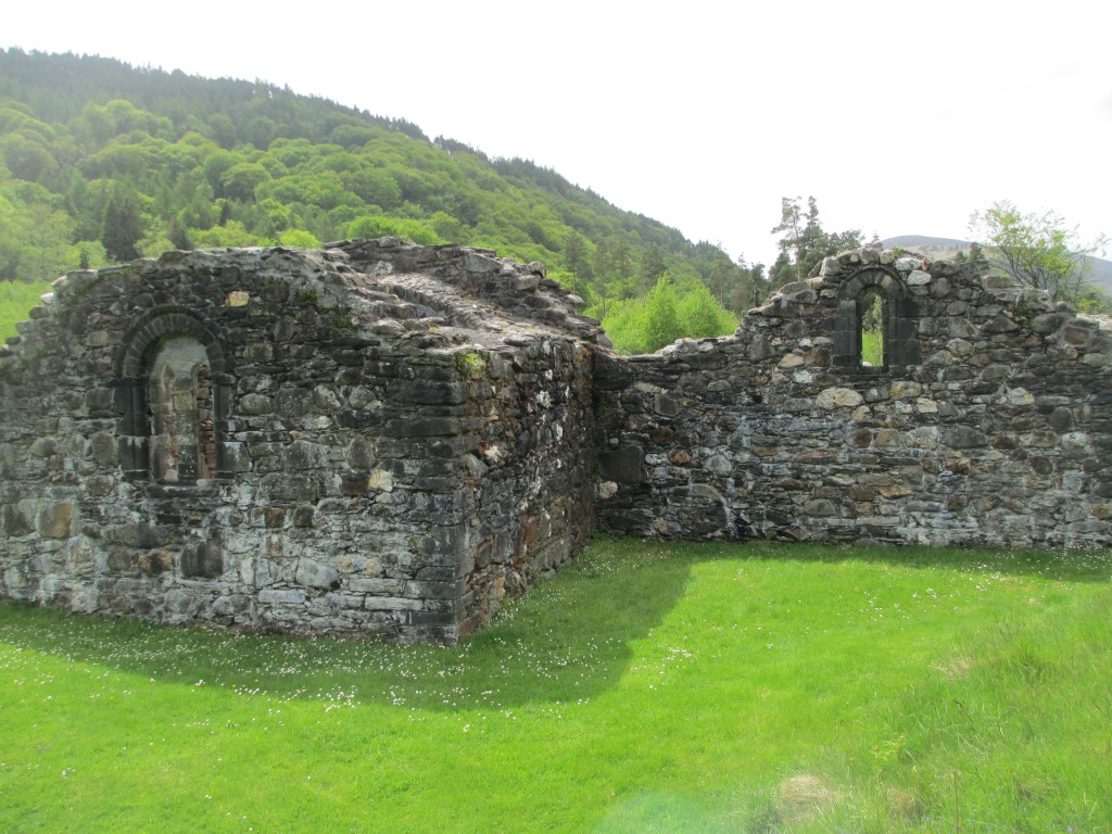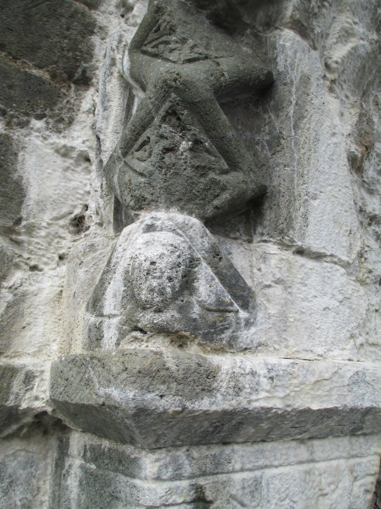 The final building I’m going to discuss is actually a short walk from the main settlement of Glendalough. St Saviour’s Priory was probably the last of the major buildings at Glendalough. It stands alone in a landscape that can’t have changed much since it was built in the mid 12th century CE. It is also the most elaborate of the Glendalough buildings, with a clear Norman Romanesque construction. It was restored in 1875. It is an unusually wide building, but what is most memorable for me, and most interesting, is the amount of carvings that have survived. You can see them and the church itself in the photos below.