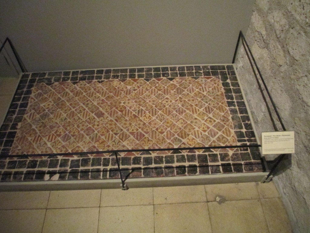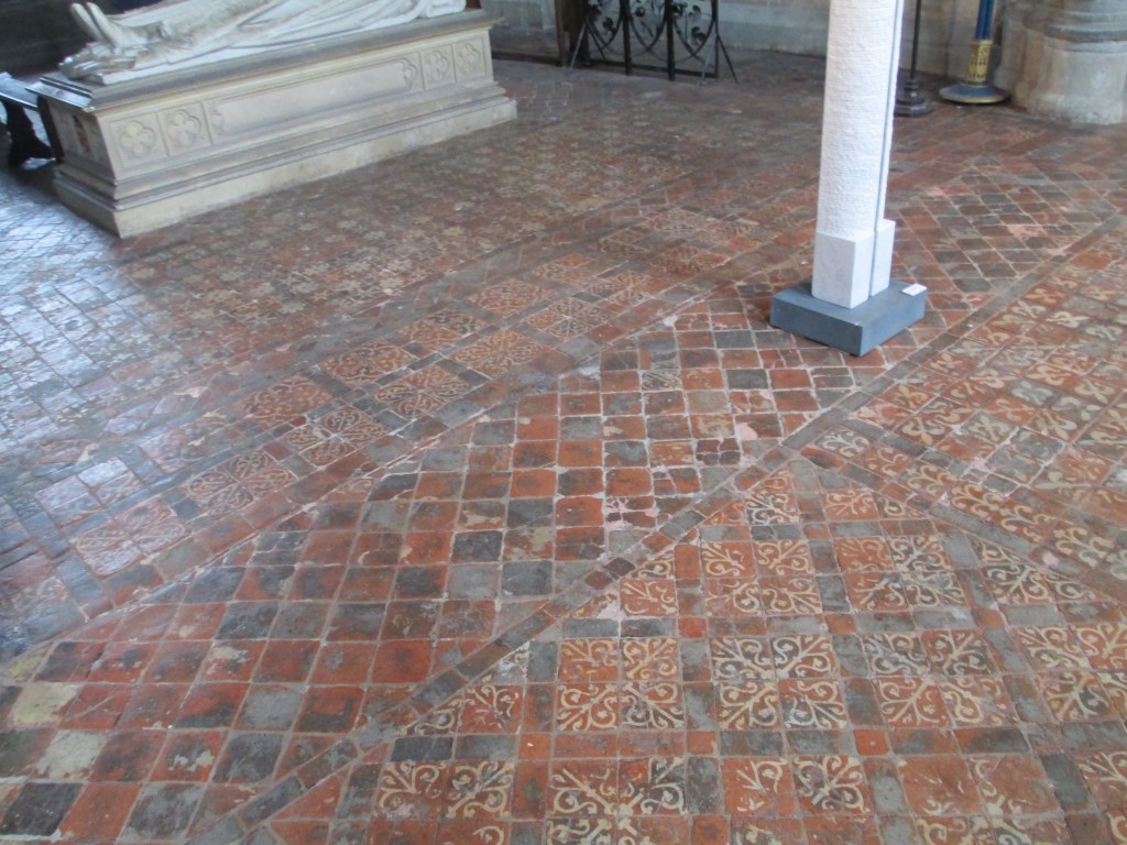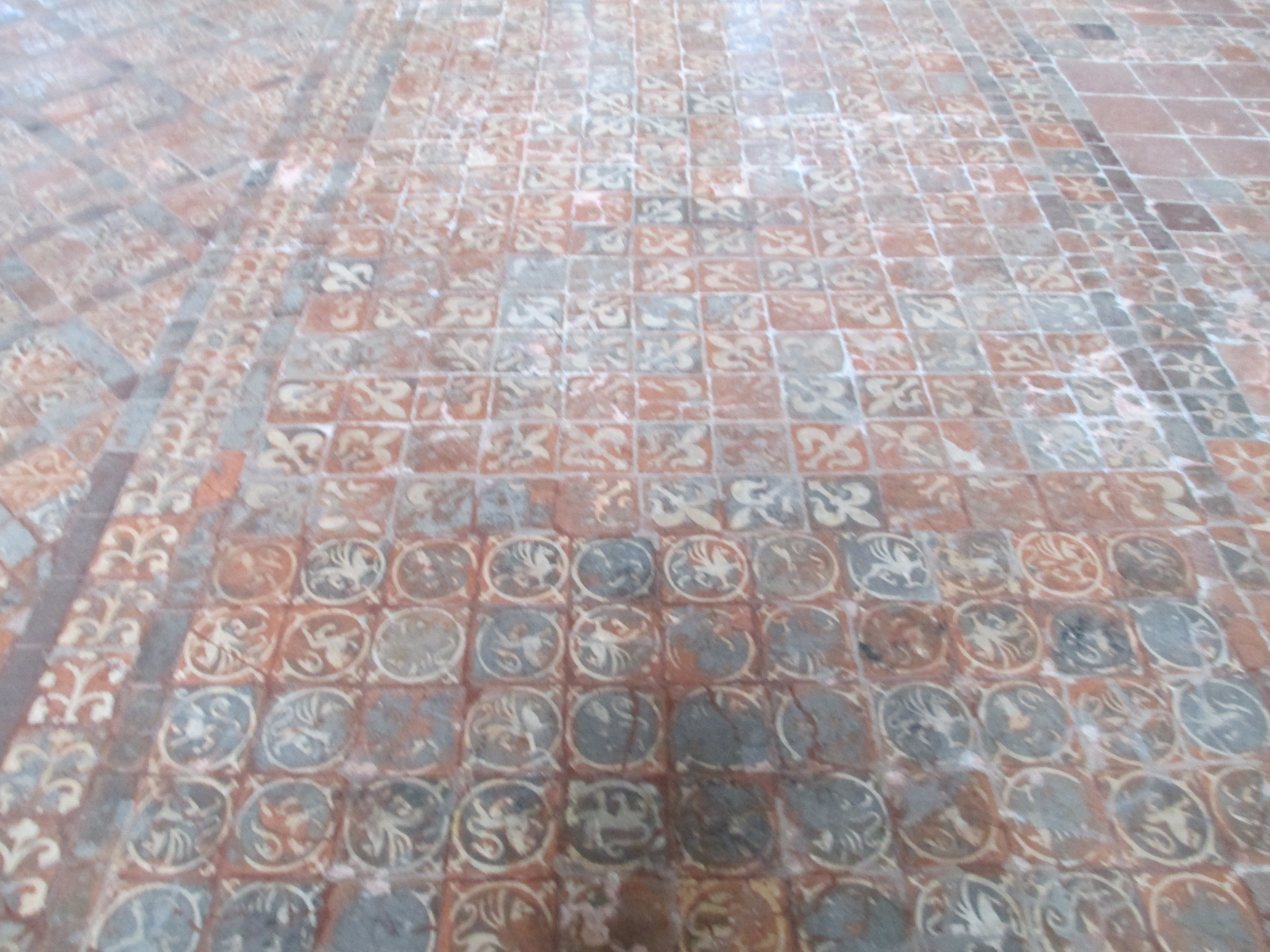 This pavement dates to the end of the 13th century, is of two coloured tiles, with a mosaic border and you can see the heraldic Fleur de Lis as well.