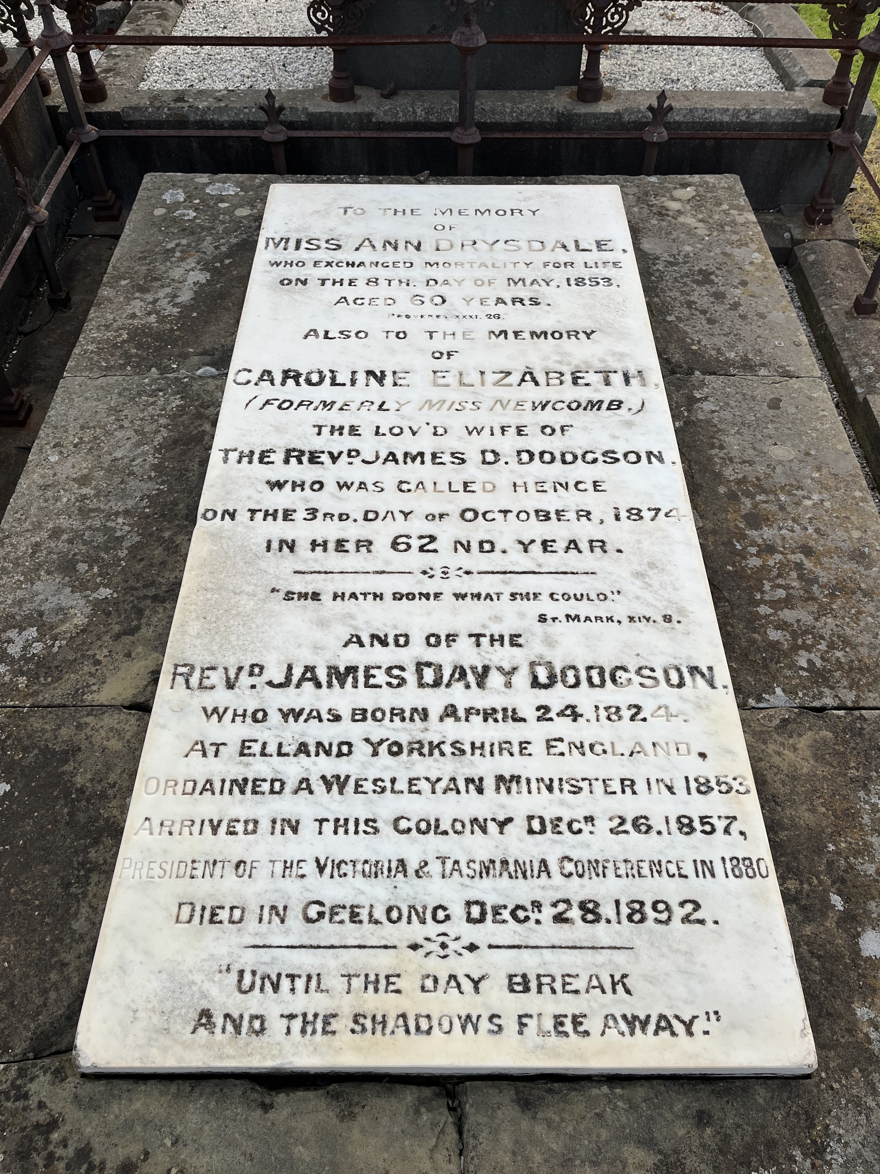 This isn’t to say that Caroline was languishing at home for eight years pining. She was heavily involved in the local area. She scooped most of the fruit and vegetable prizes at the Geelong show in 1856. She was also an outspoken political activist, and through her involvement with the Roads Board was probably one of the first women involved in government in Victoria. She was also the president of the benevolent society for the women of Geelong the Western District (and she founded the organisation). All of this while continuing to run Coriyule. Then in 1857 Reverend James Dodgson came into the area and stayed with Caroline at Coriyule as he was occupying the position of minister at Drysdale. He was said to have been of a sickly constitution. In 1861 Caroline and James were married. Apparently to the universal astonishment of everyone who knew them. Caroline was known to have said that she married him for God not for herself. James was twelve years younger and for him Caroline was a catch as one of the wealthiest and most powerful women in the region. They lived at Coriyule until James was well enough to take up his calling again. In 1864 they left Coriyule as he was appointed to the Maldon circuit. Caroline was described as the perfect minister’s wife (you get the feeling Caroline never did anything by halves). Caroline died in 1874 in Brunswick and, tellingly, was buried back at Coriyule with Anne. Sometime before his own death James had Anne and Caroline re-interred in East Geelong Cemetery, where he too was buried. As you can see in the photo below Anne’s inscription feels like an afterthought (possibly deliberate) her name is spelt wrong, her date of death is wrong and James didn’t even include the bible verse that Caroline had chosen for Anne and which had been included on the original tomb- just a reference to it. For the record the verse is she opened her mouth with wisdom and in her tongue was the law of kindness.