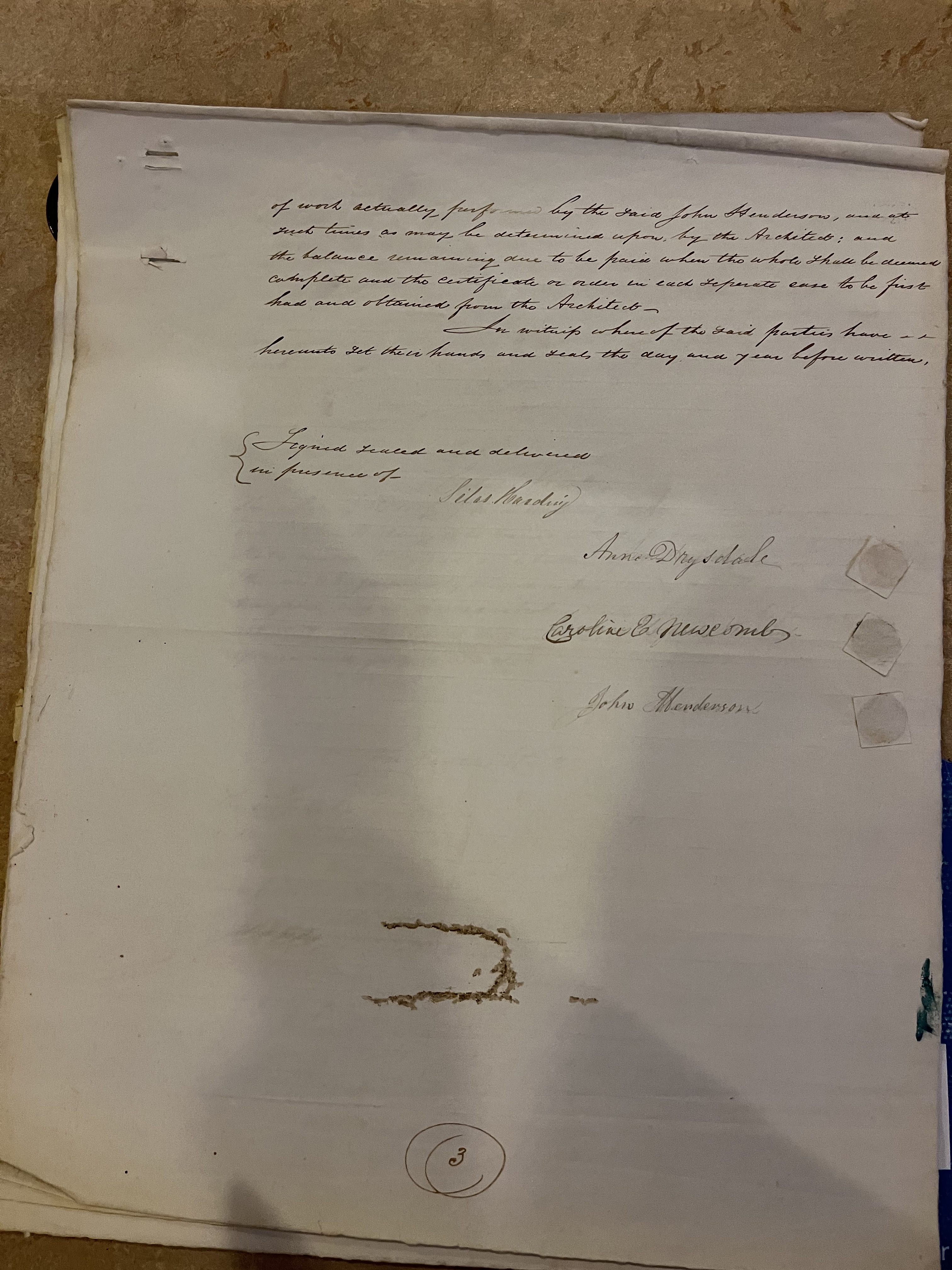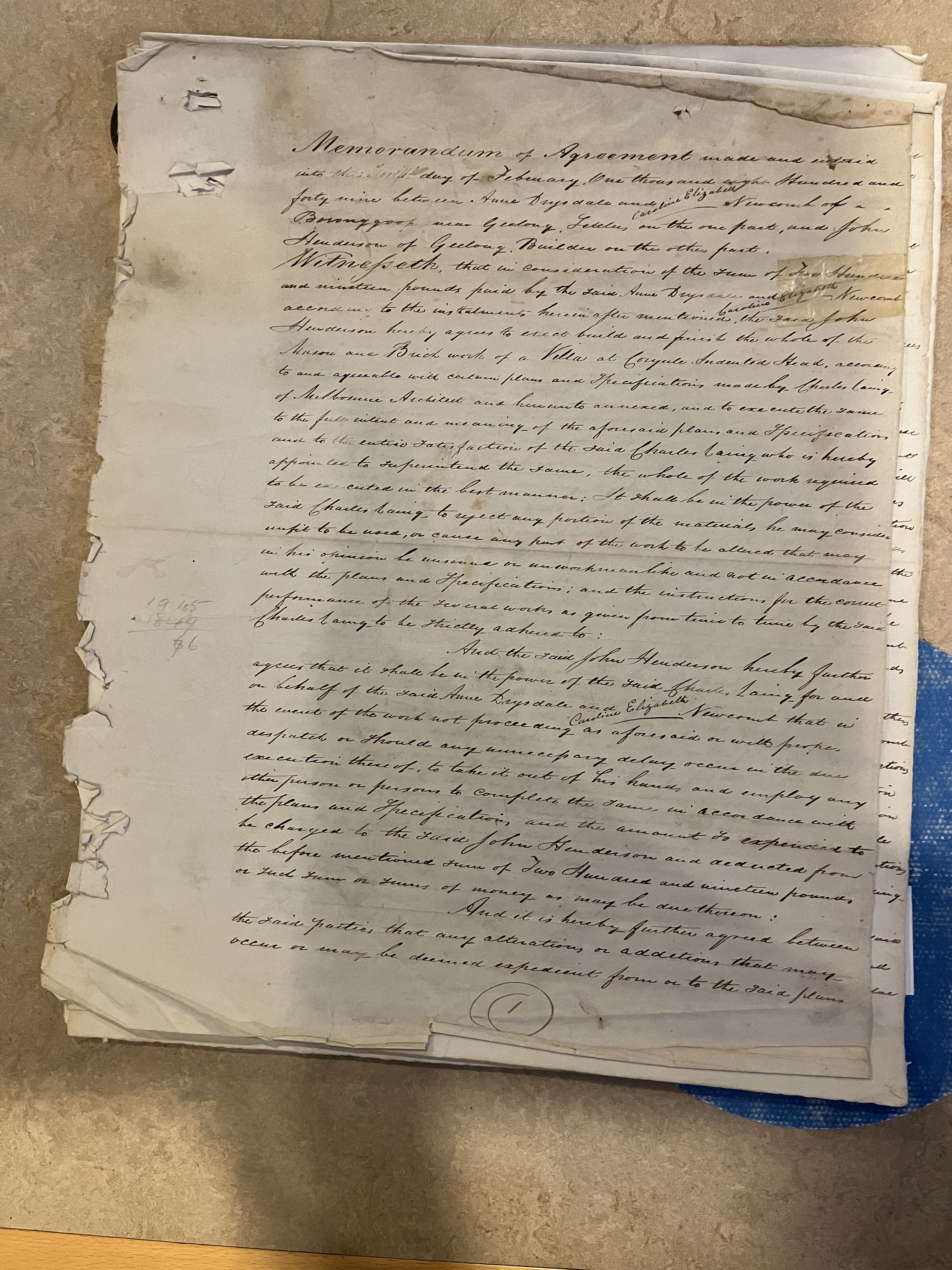 We also know that a builder named John Henderson was contracted for the sum of 219 pounds to build the ‘cottage’. You can see the first page and final page of the contract below (including Anne and Caroline’s signatures).
